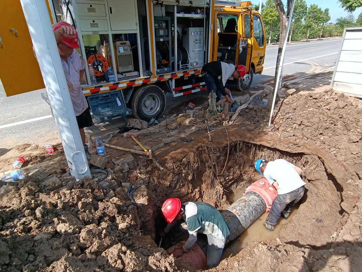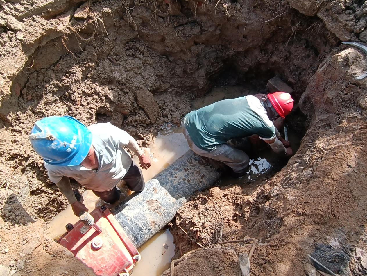 正值三伏天,天氣炎熱,氣溫高達(dá)40度。搶修人員絲毫不懼酷熱,他們在做好高溫防護(hù)后輪番上陣,有序推進(jìn)搶修工作。經(jīng)過(guò)挖掘、清理,作業(yè)坑成型,破損的DN400管道露出水面。隨后,搶修工作緊鑼密鼓展開。經(jīng)過(guò)近8小時(shí)的奮戰(zhàn),于當(dāng)天下午4點(diǎn)完成了搶修任務(wù),從最大程度上減少了對(duì)附近居民及工商業(yè)用水造成的影響。