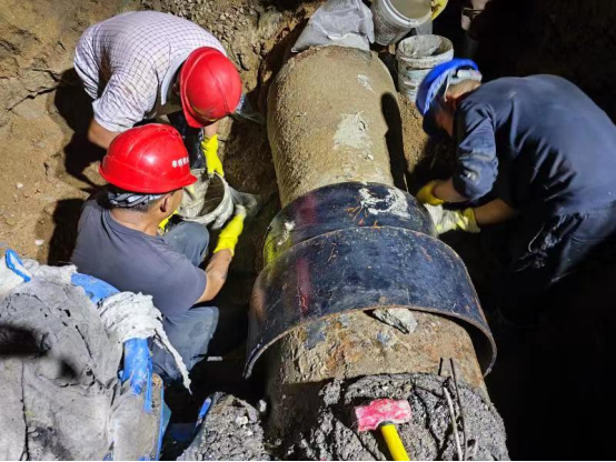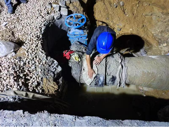 晚上22點30分,管網(wǎng)漏水點被成功修復(fù),保障沿線居民不間斷生活用水。