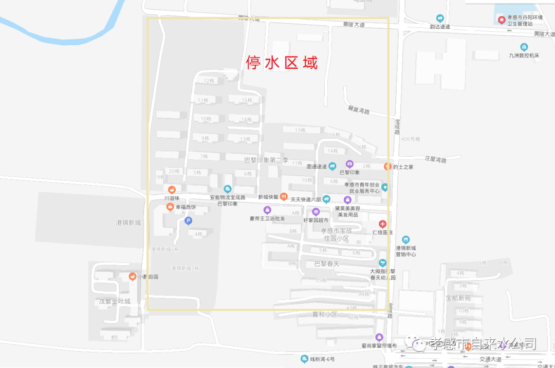 因寶成路巴黎印象供水管網碰頭,我公司將于2020年9月25日(周五)21:00至次日早晨800進行施工作業(如遇雨天,施工順延),屆時仁信醫院、巴黎印象,巴黎春天、港錦新城、寶成佳園等小區及周邊區域將暫停供水。請上述區域的客戶相互轉告,提前儲水備用,并及時檢查和關閉內部用水設施。